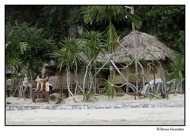 Embarcamos rumbo a otro de los momentos cumbre del viaje:  los «bungalows». Al elegir la excursión por la bahía de Halong, decidimos cambiar el hotel-torre en la ciudad de CatBa, feísimo por cierto, por unos bungalows-cabañas en la playa. Eso sí, sin la posibilidad de poder verlos impresos en fotografías o en algún folleto, lo cual en Vietnam es una aventura. Pero cuál fue nuestra sorpresa cuando Vietnam nos sorprendió con esto…..