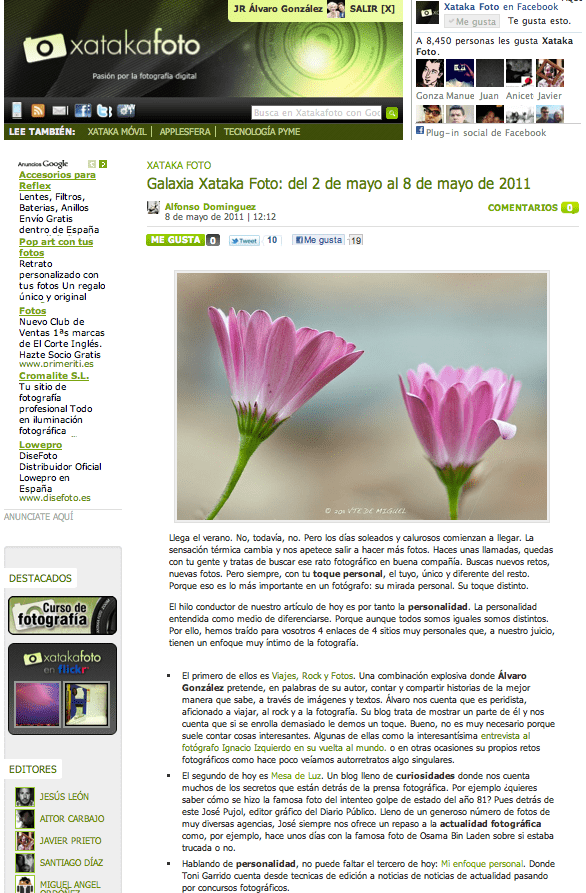 Un honor haber tenido un huequito en Xataka Foto y acompañado de otros grandes blogs como Mesa de Luz, Mi enfoque personal y Fotógrafo Nocturno.